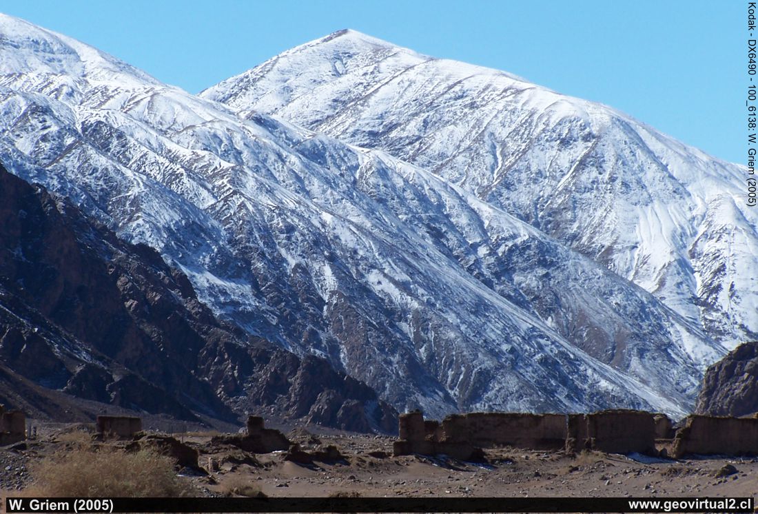 Photo: The Ruins of Puquios with the snow-capped mountains of the Atacama Desert. (W. Griem, 2005; Kodak6138) - Large Photo
