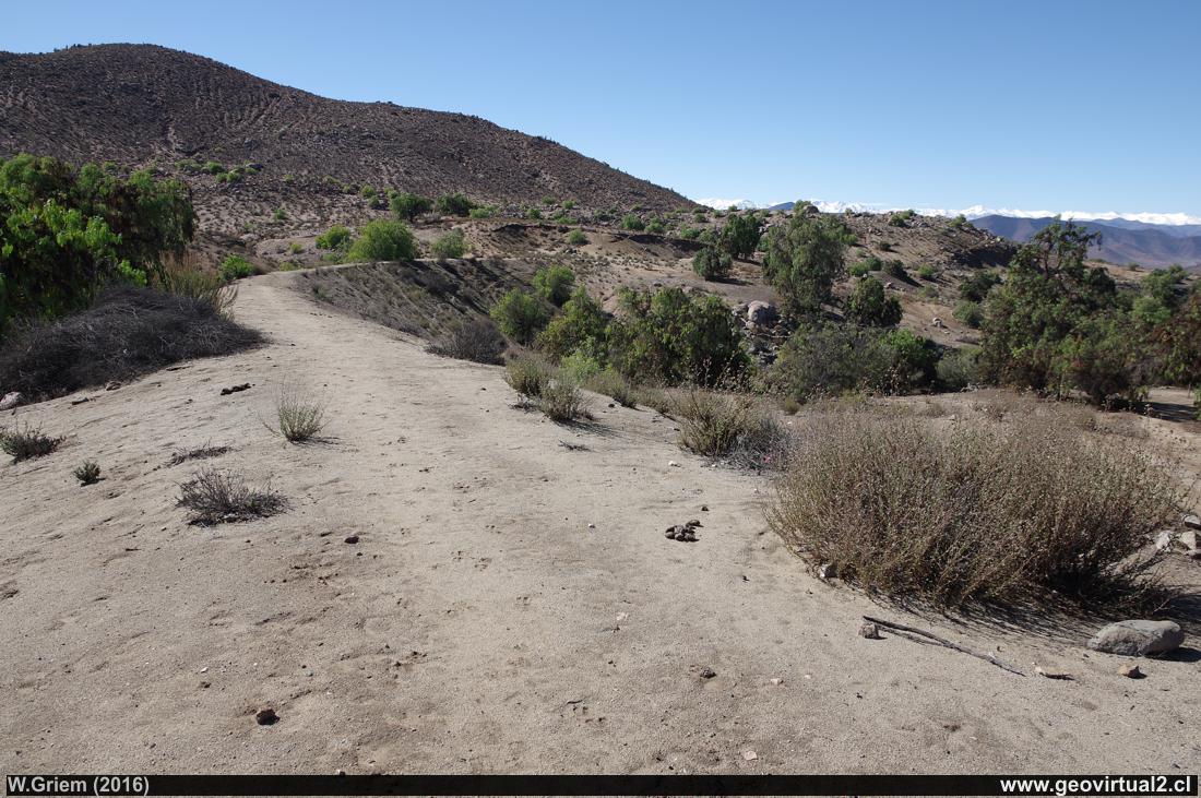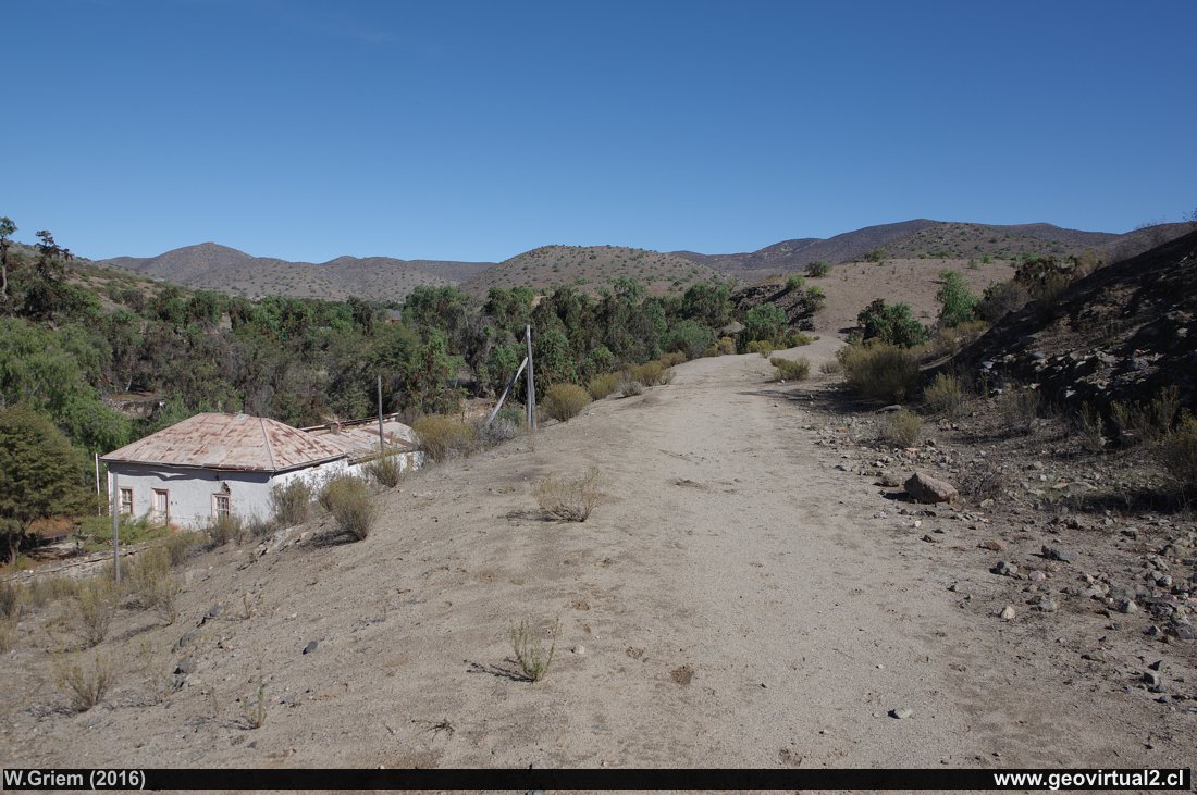 Foto: Terraplén del ramal a la mina Panulcillo con la escuela al lado izquierdo. (Región de Coquimbo): (W. Griem, 2016 - Pentax3198) - en grande