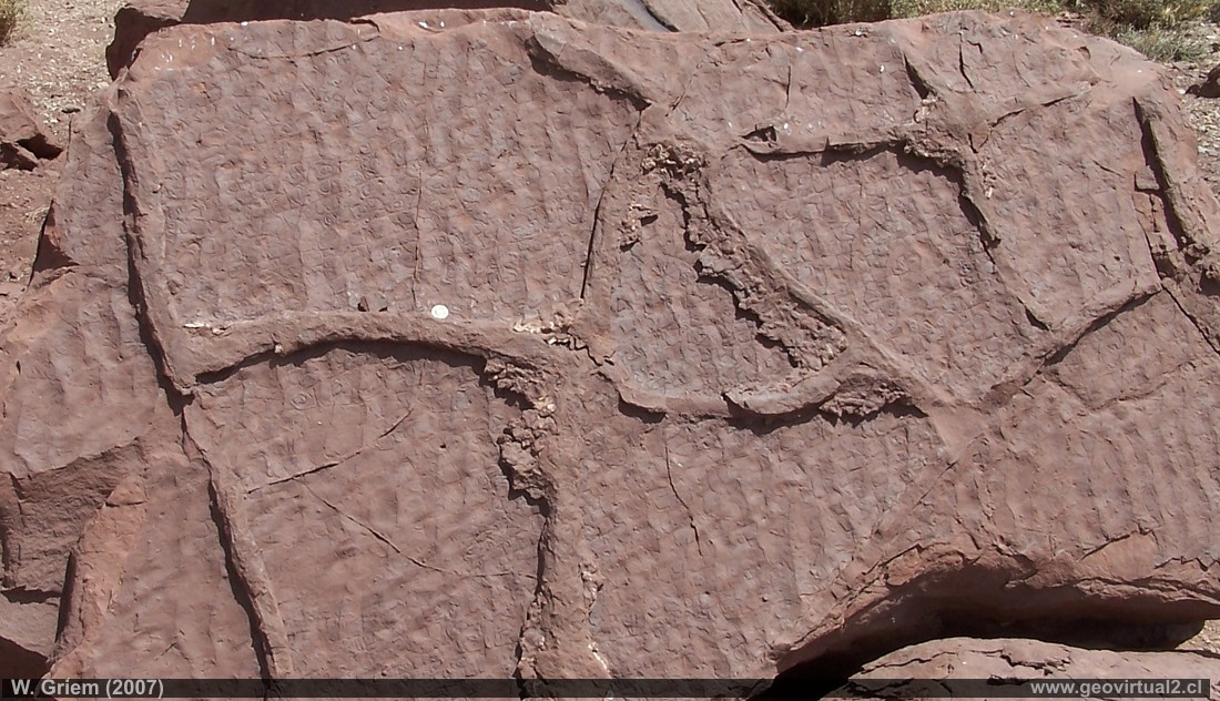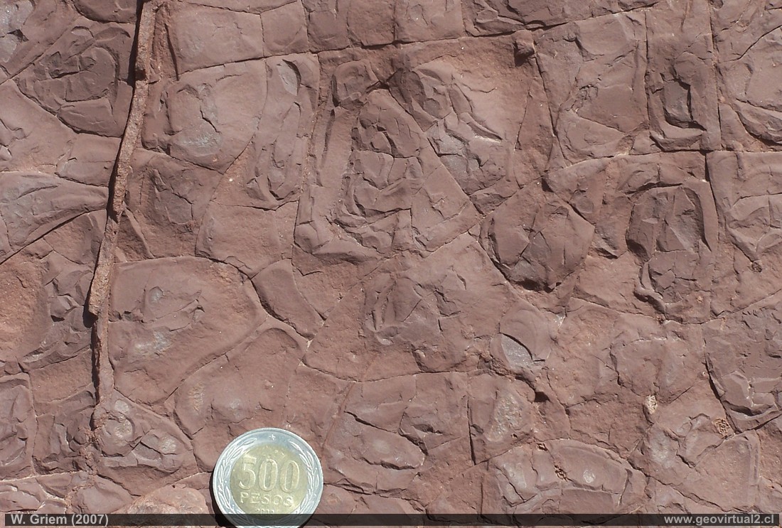 Foto: Detalle de Grietas de resecación en areniscas rojas del jurásico. Sector "El Patón, Llano Leoncito - Región Atacama, Chile. Foto W. Griem (2007) - Foto grande