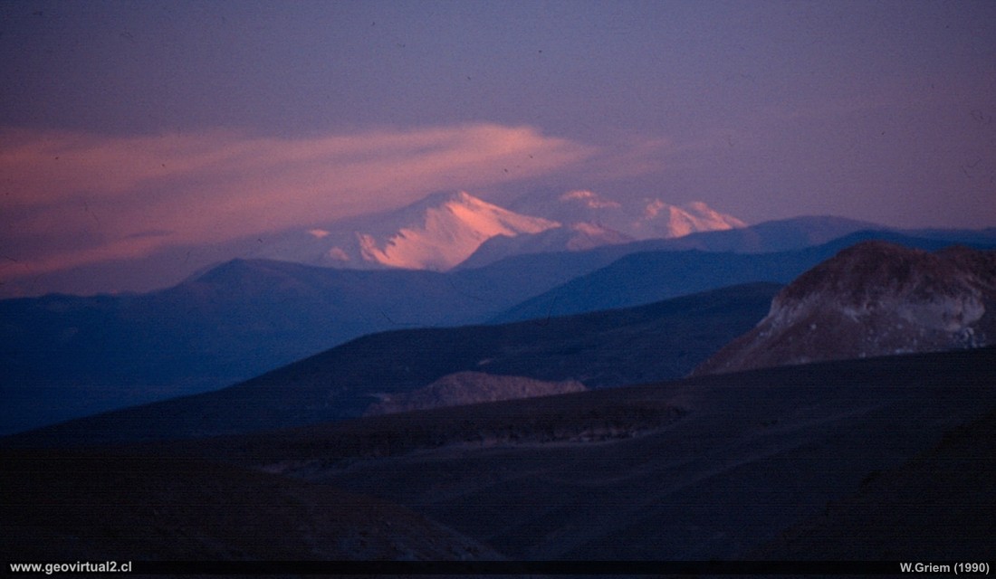 Die Tres Cruces beim Sonnenuntergang von Acerillos / Salitral Pass aus gesehen. (W. Griem 1990; RicohKR10X). - Foto in groß