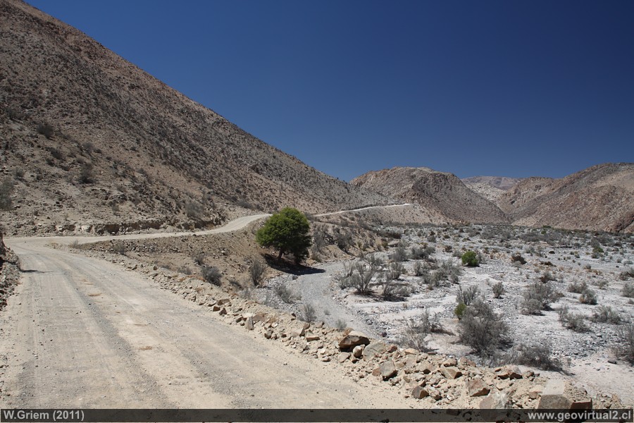 Foto: Camino en la quebrada Algarrobal entre El Donkey y Merceditas. El camino nuevo sigue hacia al sureste para llegar en algunos kilómetros a Merceditas; Región Atacama, Chile. (Foto W. Griem; 2011; Ca50D6389) Foto en grande