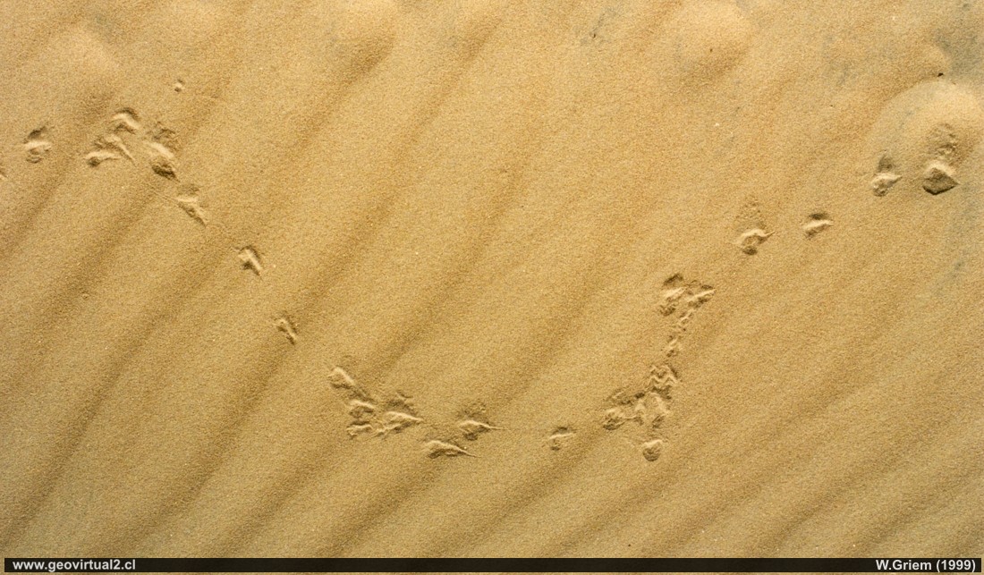 Las huellas de animales en la arena de una duna desaparece rápidamente, porque los depósitos eólicos en general están siempre en movimiento.