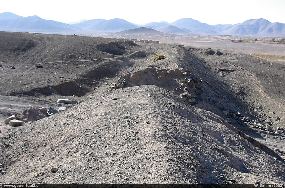 Foto: Terraplén del trayecto entre la planta de la Mina Dulcinea y la fundición en la entrada a la Quebrada Puquios en las cercanías de Carrera Pinto; Región Atacama. Noviembre de 2003 (W. Griem; CaPS1467) - foto grande