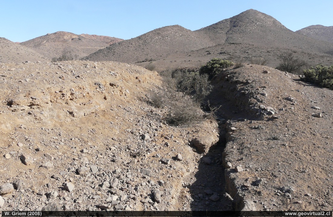 Foto: Corte del trayecto del ex-ferrocarril a la mina Coquimbana, Región Atacama - Chile. (W. Griem, 2008 - Panasonic261 ) - en grande